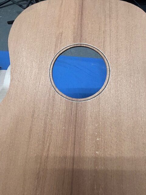 the rosette is typical rosette of tortoise and white. Simple and it will have matching tortoise binding. The head stock veneer is Bloodwood , and I used matching Bloodwood for the fretboard ( 1 3/4 nut 12 in radius 24.75 scale). The spacing on the bridge  is 2 1/4 in and is matching Bloodwood. The fretboard is radiused.